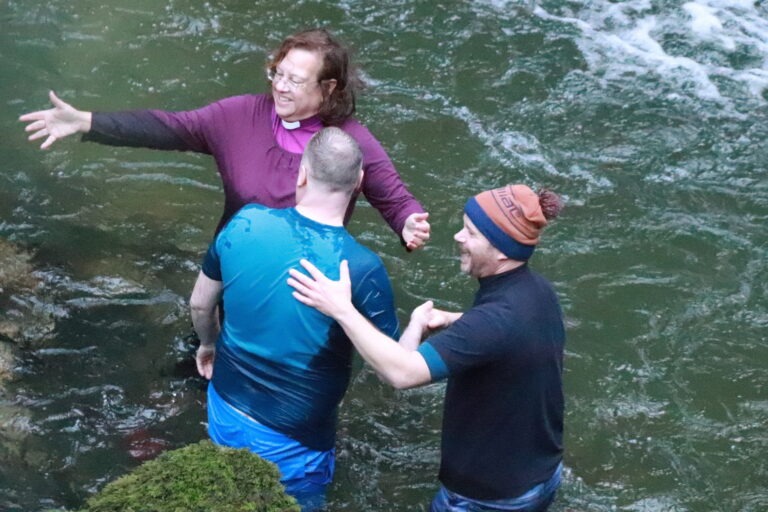 On New Year’s Day, amidst hail showers and a strong cold wind, Bishop Tricia and Pioneer Minister Rev Alex Brown carried out an open-air baptism service and renewal of vows