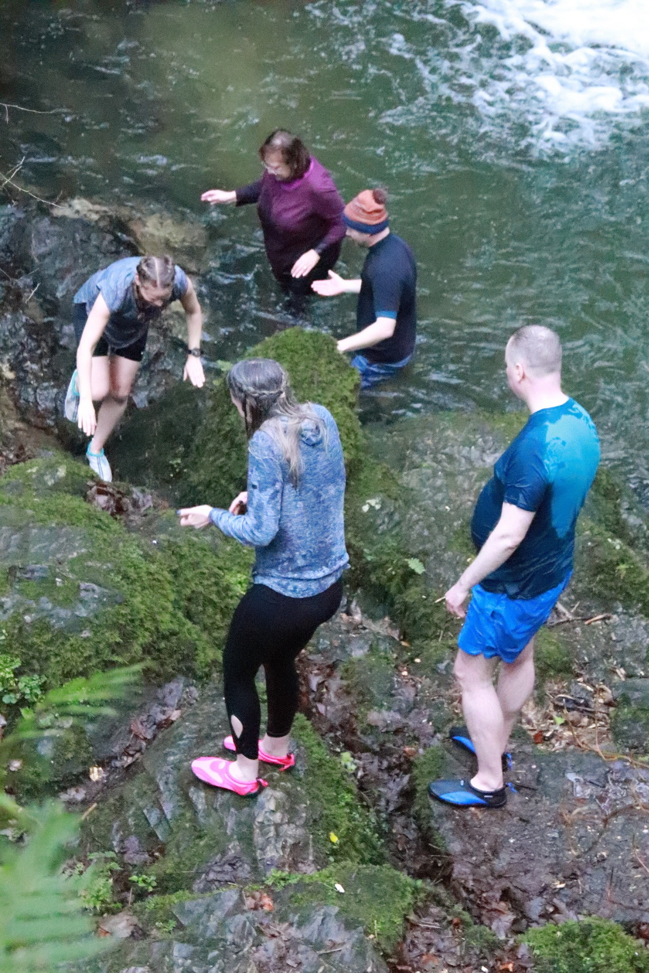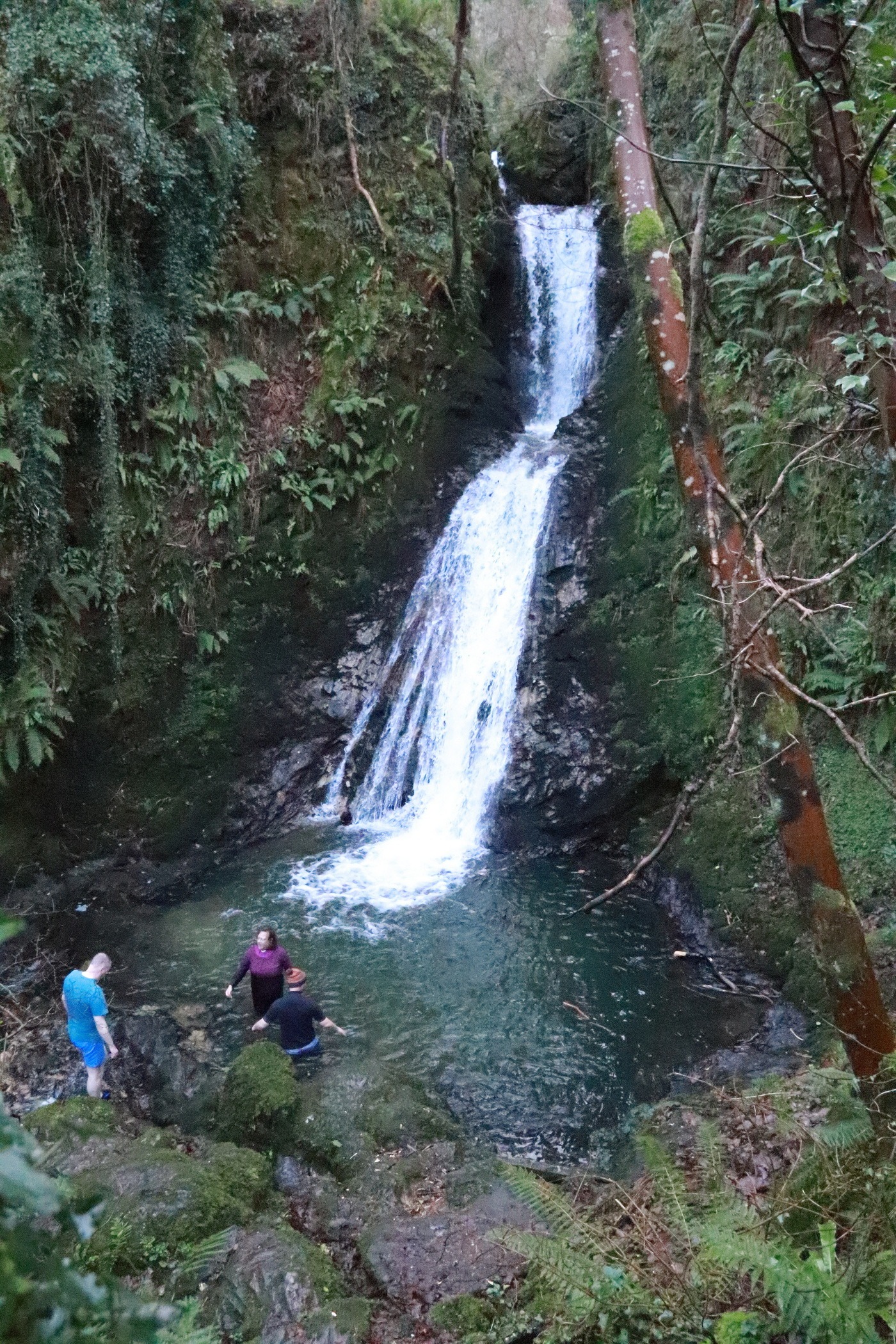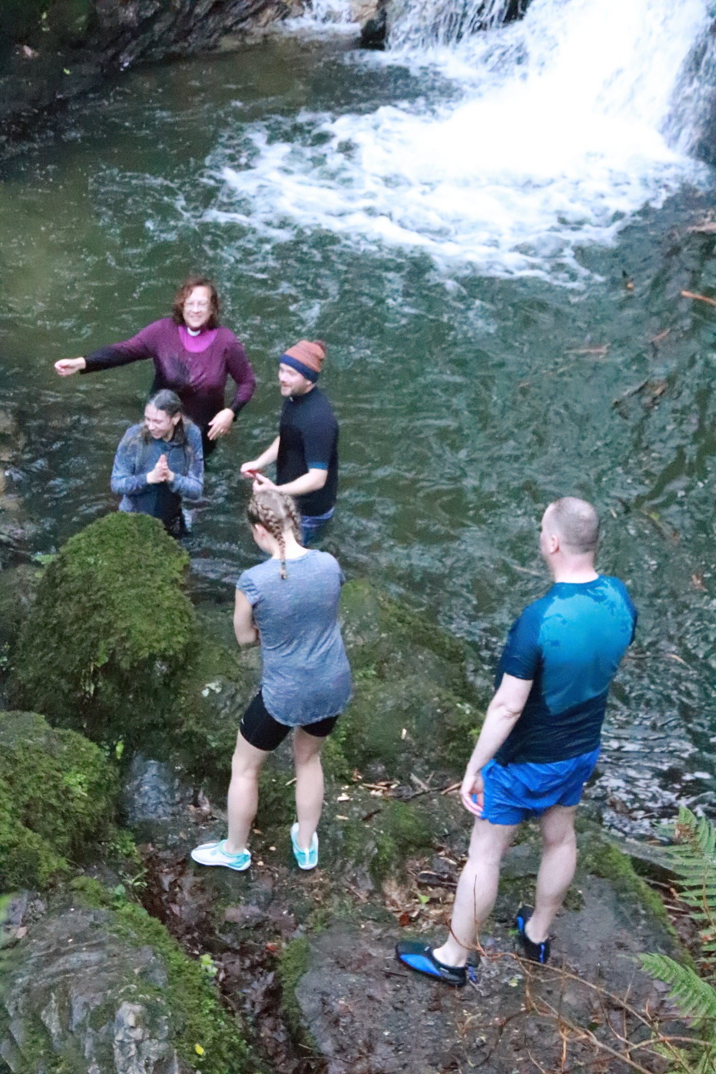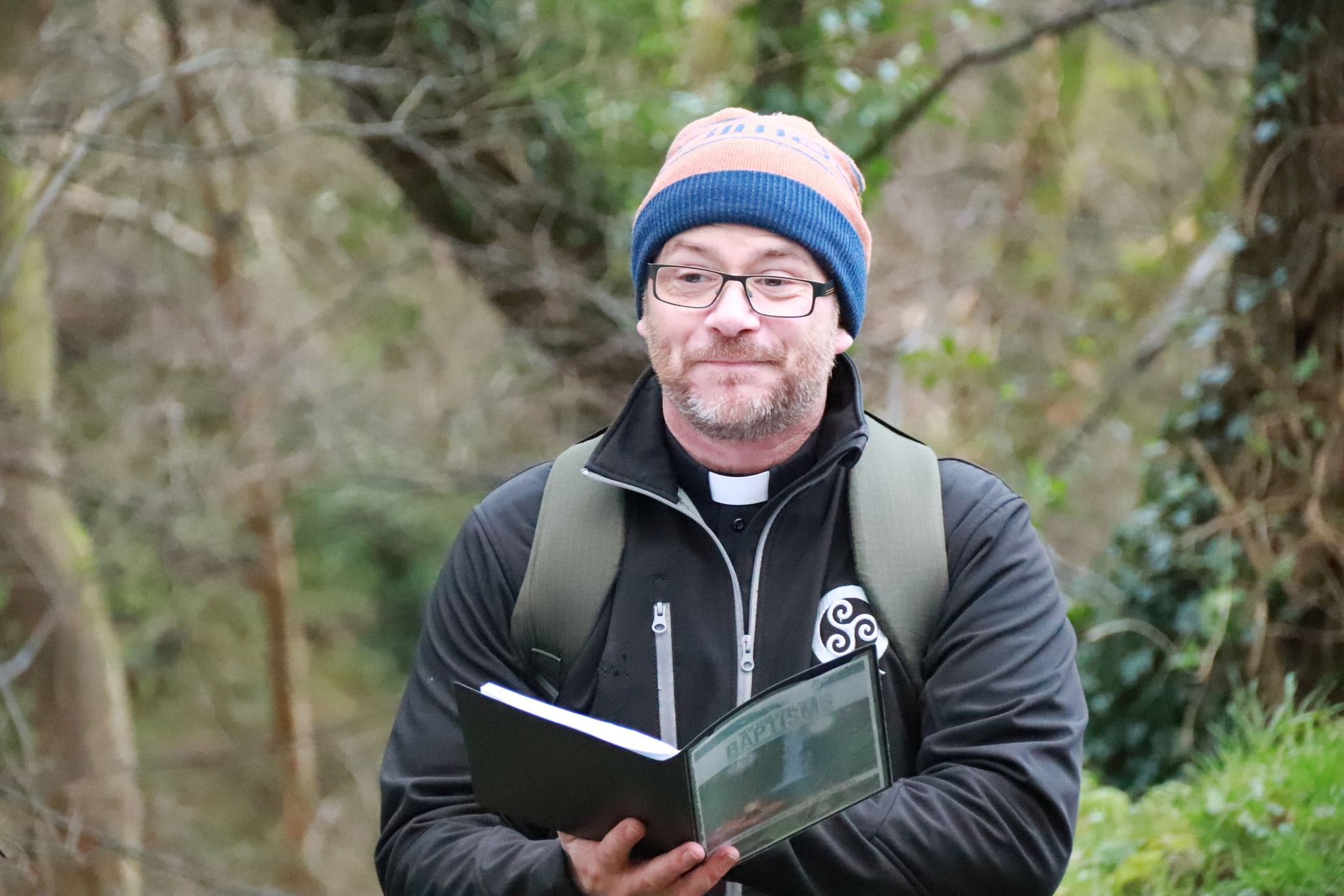 On New Year’s Day, amidst hail showers and a strong cold wind, Bishop Tricia and Pioneer Minister Rev Alex Brown carried out an open-air baptism service and renewal of vows with members of the Pioneer Church. It was a short contemporary service rooted in the ancient traditions and standing in the heritage of Cabbel Pherrick. It started at the ancient keeill Cabbal Pherick (Patrick’s Chapel) deep in the countryside south of Kirk Michael and then the group descended the steps to Spooyt Vane waterfall for the full immersion baptisms.